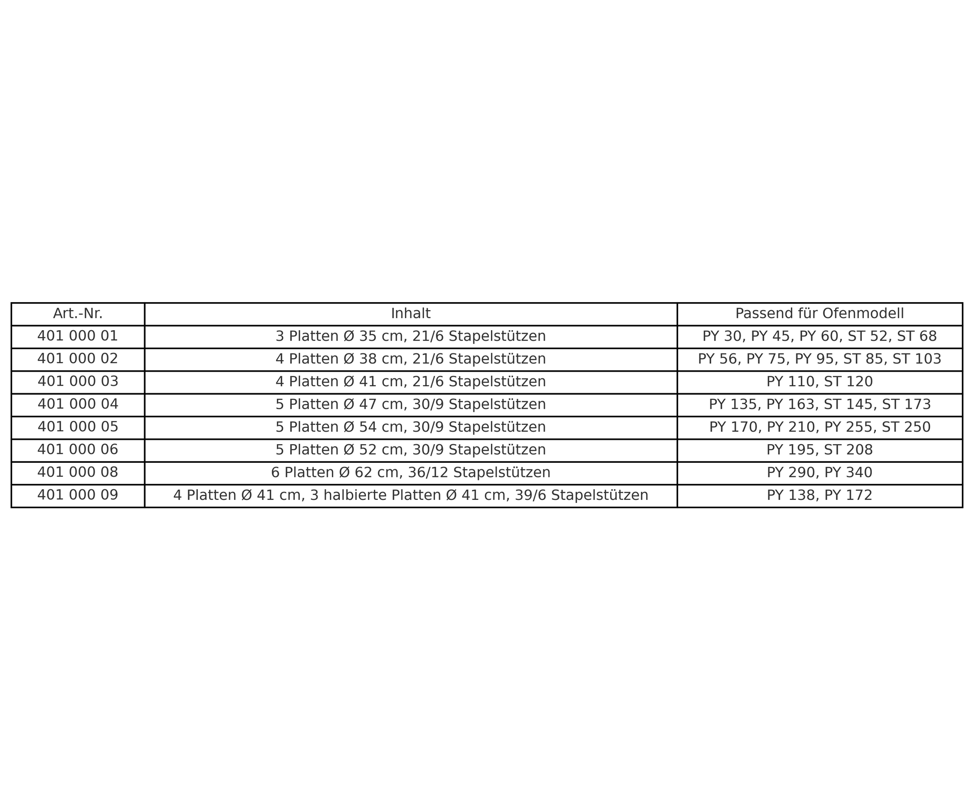 Jedes Set ist exakt auf das jeweilige Ofenmodell abgestimmt und enthält die passende Anzahl an Ofenplatten und Stapelstützen. Dadurch lassen sich keramische Werkstücke sicher platzieren und gleichmäßig brennen – ideal für eine effiziente Beschickung des Ofens.