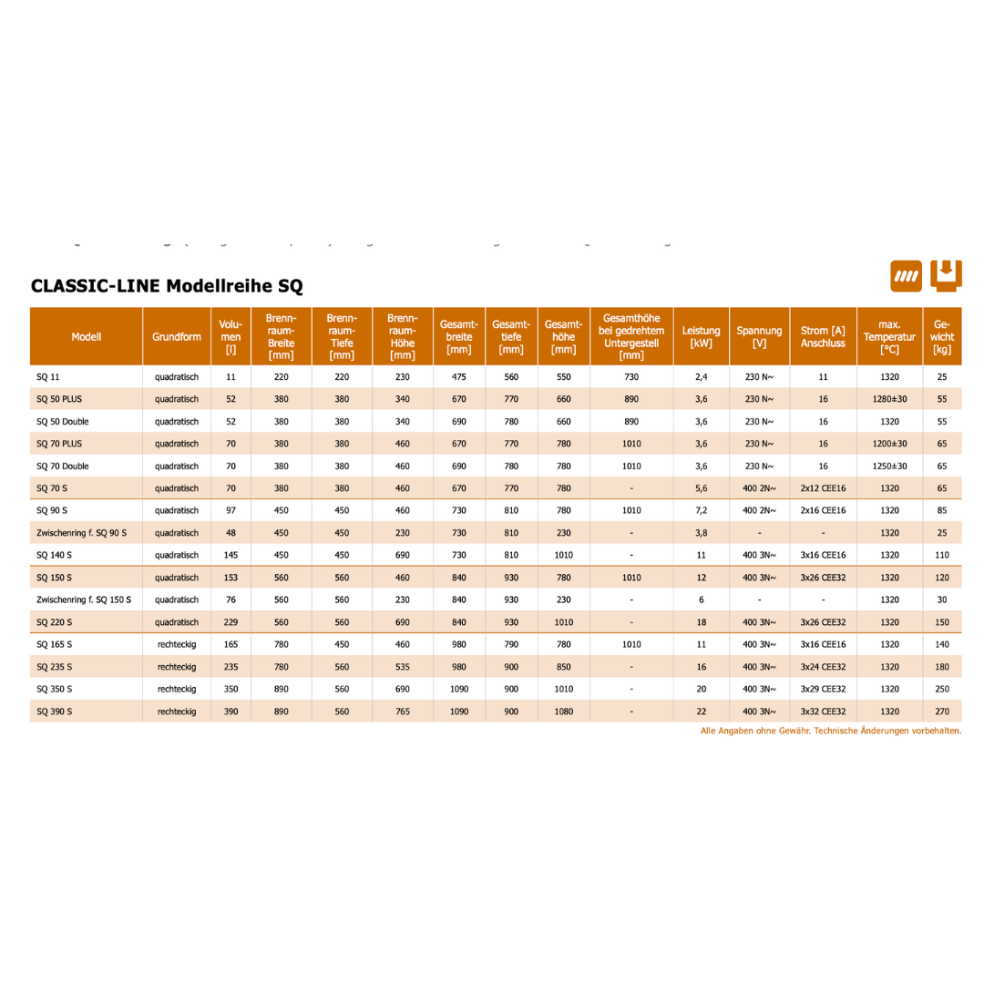 Modell SQ 11 – 11 Liter Volumen | 2.4 kW | 230 V Modell SQ 50 PLUS – 52 Liter Volumen | 3.6 kW | 230 V Modell SQ 50 Double – 52 Liter Volumen | 3.6 kW | 230 V Modell SQ 70 PLUS – 70 Liter Volumen | 3.6 kW | 230 V Modell SQ 70 Double – 70 Liter Volumen | 3.6 kW | 230 V Modell SQ 70 S – 70 Liter Volumen | 5.6 kW | 400 V Modell SQ 90 S – 97 Liter Volumen | 7.2 kW | 400 V Modell SQ 140 S – 145 Liter Volumen | 11 kW | 400 V Modell SQ 165 S – 162 Liter Volumen | 11 kW | 400 V Modell SQ 220 S – 229 Liter Volumen | 18 kW | 400 V Modell SQ 390 S – 390 Liter Volumen | 22 kW | 400 V