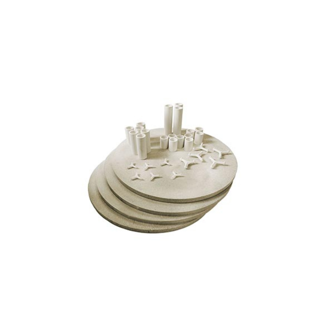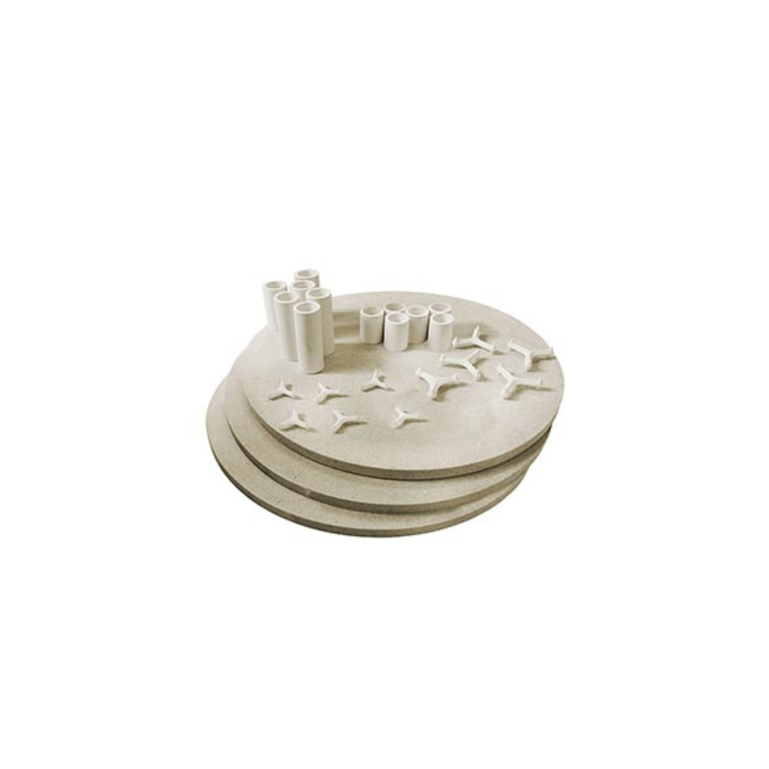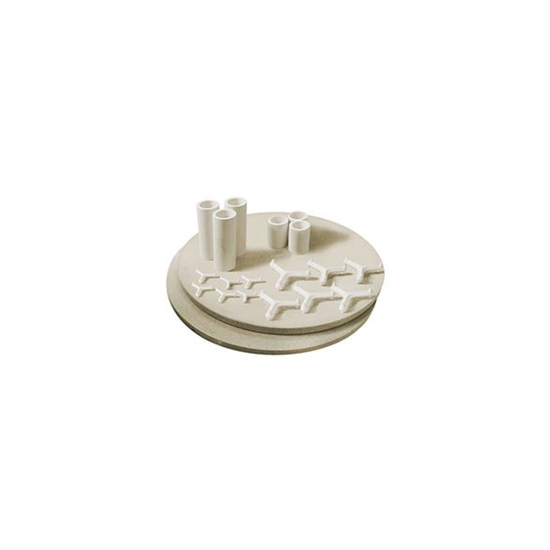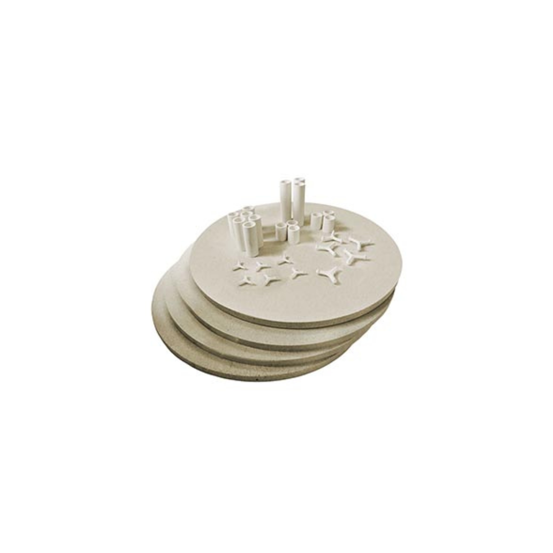 Jedes Set besteht aus hochwertigen Cordierit-Brennplatten und Silimanit-Stützen Ø 40 mm in abgestuften Höhen. Die Materialien sind wärmeschockfest, keramikfaserfrei und langlebig. Ein Keramik-Dreifuß-Set garantiert präzise Abstände, während das beiliegende Trennmittel das Anhaften von Glasuren verhindert. Cordierit-Klötzchen sichern die Basislage und gewährleisten eine stabile Konstruktion.